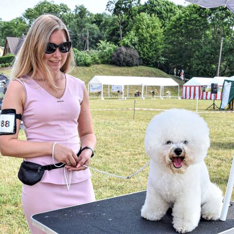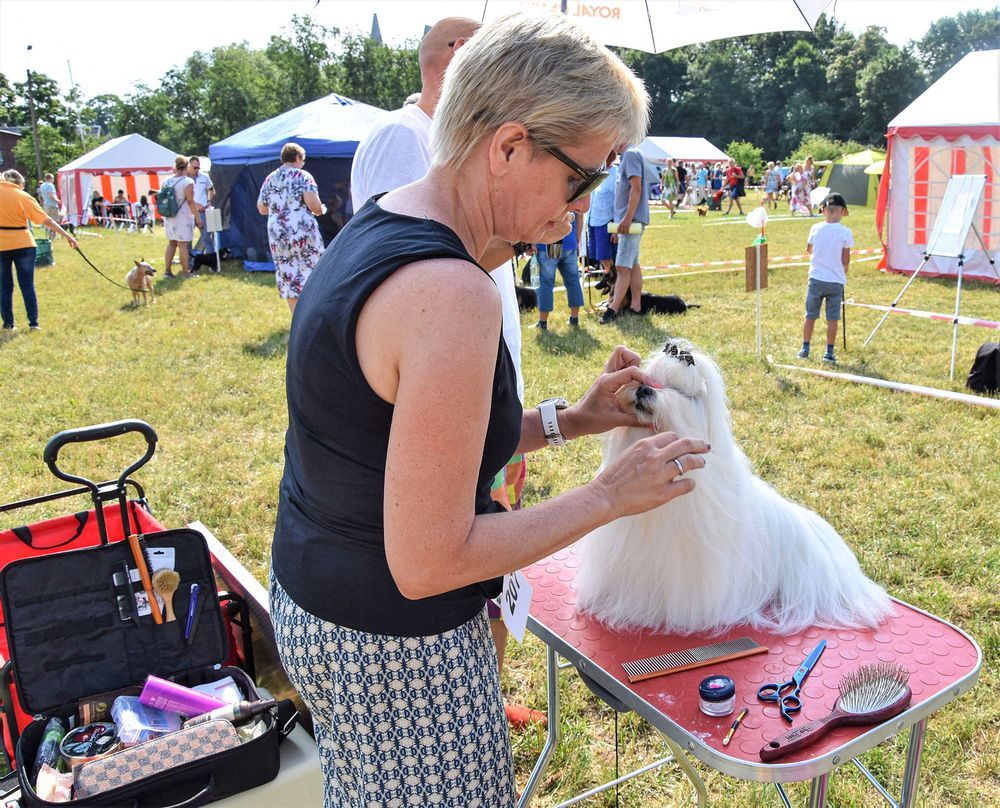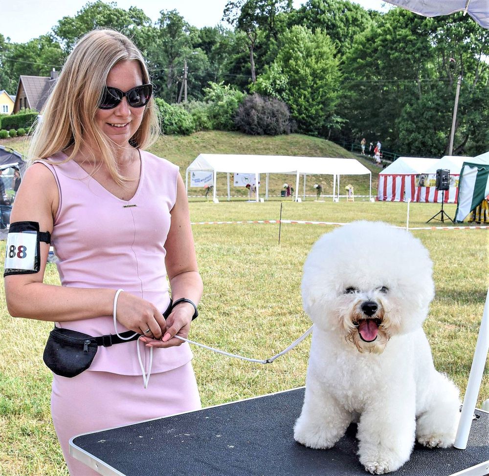 Ša­lia ant „pro­cedū­ri­nio“ sta­liu­ko pa­ro­dai bu­vo ruo­šia­mas gar­ba­no­to­jo bi­šo­no gi­mi­nai­tis il­gap­lau­kis Mal­tos bi­šo­nas. Pa­si­ruo­ši­mas rim­tas – rei­kia ir ilgą plauką pa­šu­kuo­ti, ir kas­pinėlį įriš­ti. Jei no­ri būti gra­žiau­sias, prie bi­šonų kar­tais ten­ka ir pud­ros še­petė­liu pri­si­lies­ti, apie akis pa­pud­ruo­ti.
