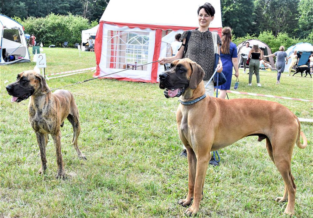 Šeš­ta­dienį pa­ro­dos da­ly­vių dėmesį traukė vo­kie­čių do­go veislės šu­nys – bro­lis ir se­suo, vėl su­si­tikę šio­je pa­ro­do­je. Šios did­žiulės ka­lytės šei­mi­ninkė ma­ri­jam­po­lietė pa­sa­ko­jo, kad ši­tos veislės šu­nys jau at­si­ves­ti sve­ria apie ki­log­ramą, o išs­typs­ta per pus­metį. Pas­kui ne­beau­ga, tik pa­mažėl iš „bjau­riųjų an­čiukų“ tam­pa „pa­ro­di­niais“.