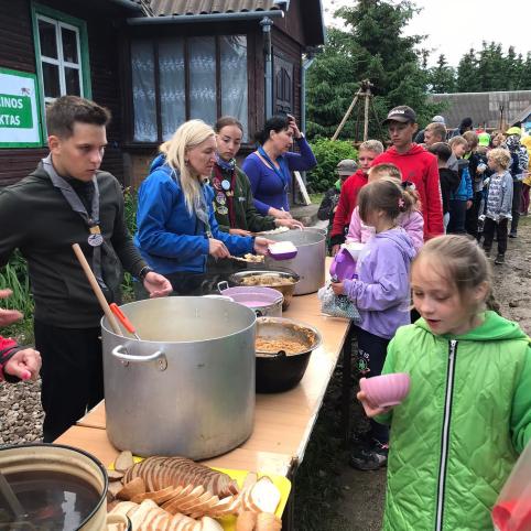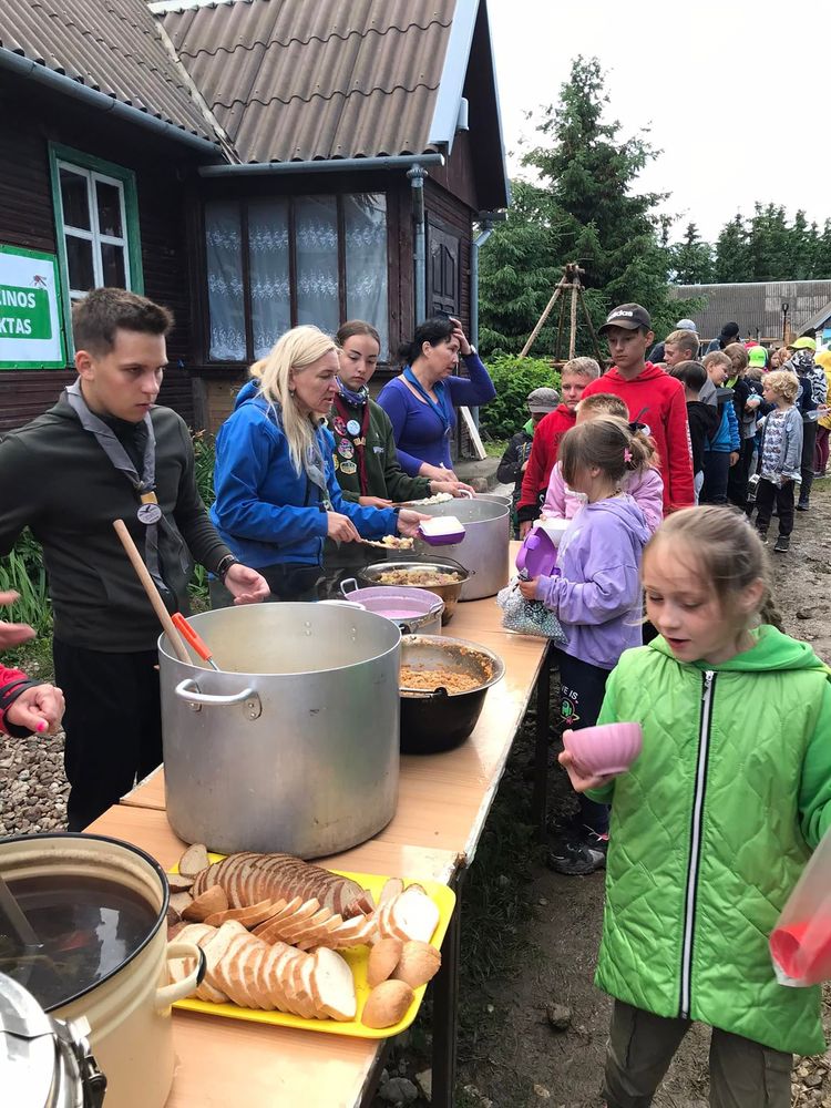 Viešė­da­mi Bal­tu­čių sodyboje iš­gir­do­me, kad vai­kai mais­tu ne­si­skund­žia – gam­to­je ki­tas ape­ti­tas nei na­mie. Ska­niau­sia, pa­sak pa­čių sto­vyk­lau­tojų, – deš­relės bei ža­garė­liai, ta­čiau grįžę iš žy­gio ar iš­sidūkę tven­ki­ny no­riai ker­ta ir ko­šes, ir dar­žo­vių sriu­bas bei šal­ti­barš­čius.