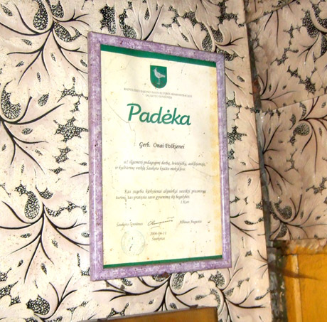 PADĖKA: Garbingą mokytojos Onos Poškienės profesinę veiklą liudija jos kambaryje ant sienos kabanti Šaukoto seniūno 2006 metais pasirašyta padėka.