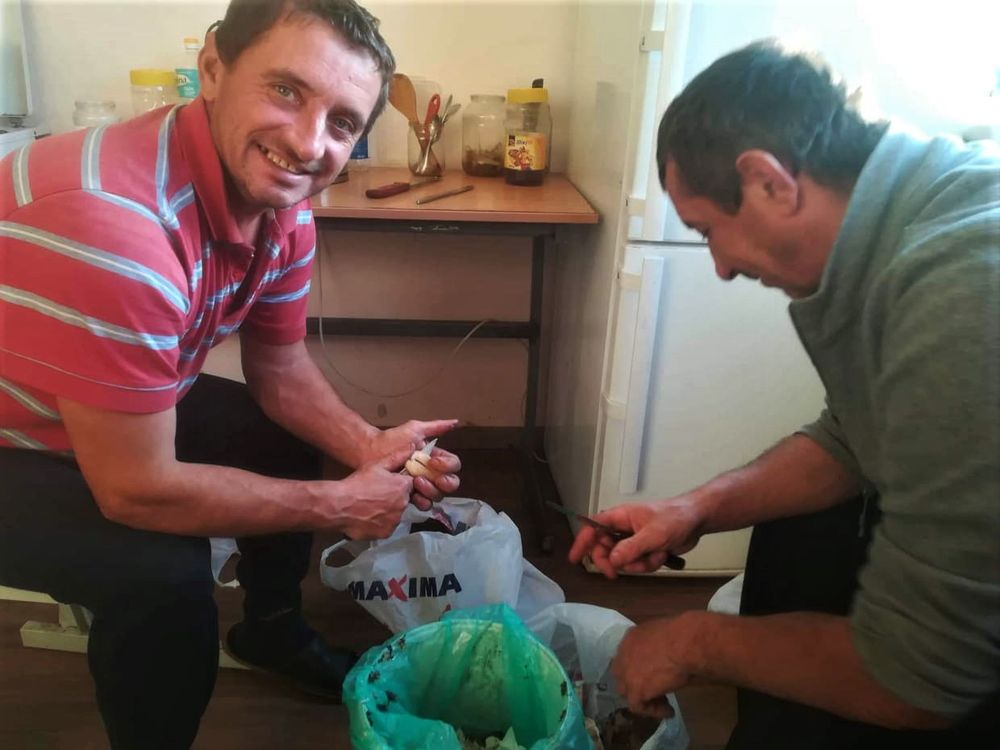 Mi­ro­nas (kai­rė­je) ir Va­si­li­jus ruo­šia va­ka­rie­nę – va­lo pa­čių miš­ke­ly­je rink­tus ba­ra­vy­kus, ku­riuos va­di­na „be­ly­je gri­by“ (bal­tie­ji gry­bai)