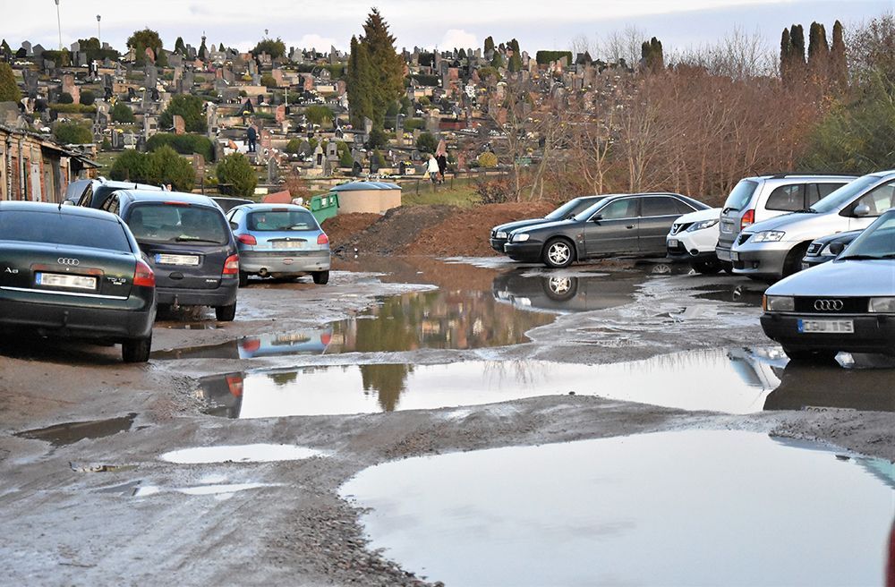 Kaip ir buvo galima tikėtis, lapkričio 1-osios išvakarėse automobilių stovėjimo aikštelė prie kapinių buvo sausakimša. Mašinų buvo pilna ir visuose keliukuose tarp garažų. O išlipusieji ir pasukę kapinių link demonstravo kone akrobatinius gebėjimus, bandydami išlaviruoti tarp aikštelę semiančių balų.