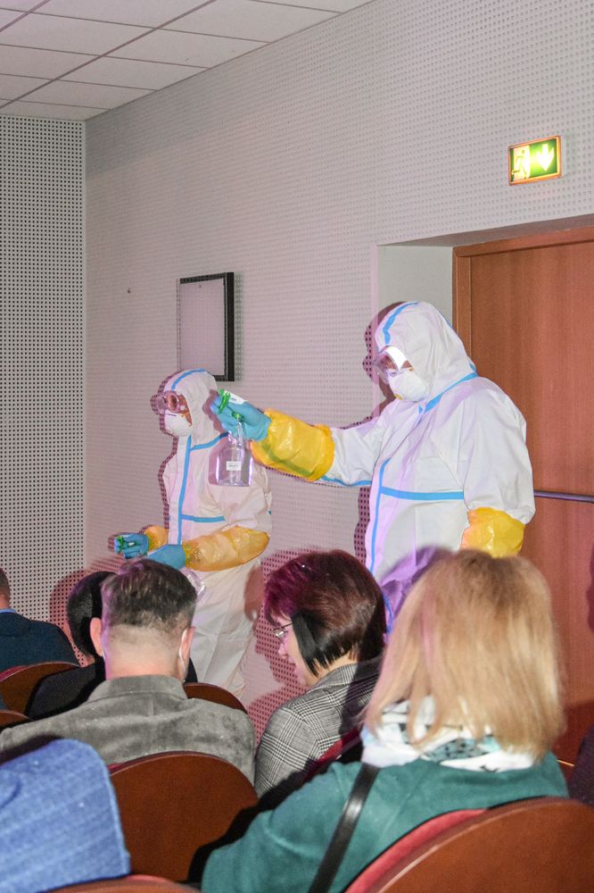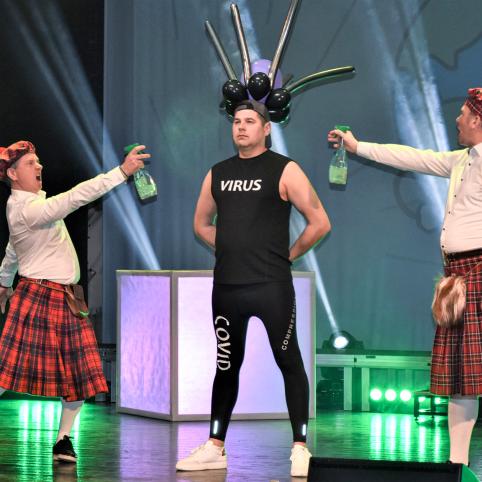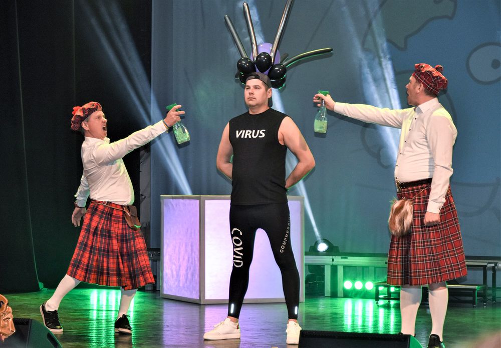 Kokia COVID-19 situacija Plungėje, per nuotaikingai suvaidintą nuotolinį susirinkimą papasakojo gydytojas Raimondas Doviltis. Tačiau jo mažai kas norėjo klausytis, nes kovido tema visiems jau įgriso iki gyvo kaulo. „Liūtai“ vienas po kito paliko susirinkimą ir sugužėję į sceną užtraukė žemaitišką dainą apie baisųjį virusą ir skiepus. „Jau gretā skiepū dous, vėsus truopnē sučipous ir į darba ka sugrīšo, būso atsipūtės...“ – traukė „liūtai“, o tuo tarpu „medikai“ salėje atliko dezinfekciją.