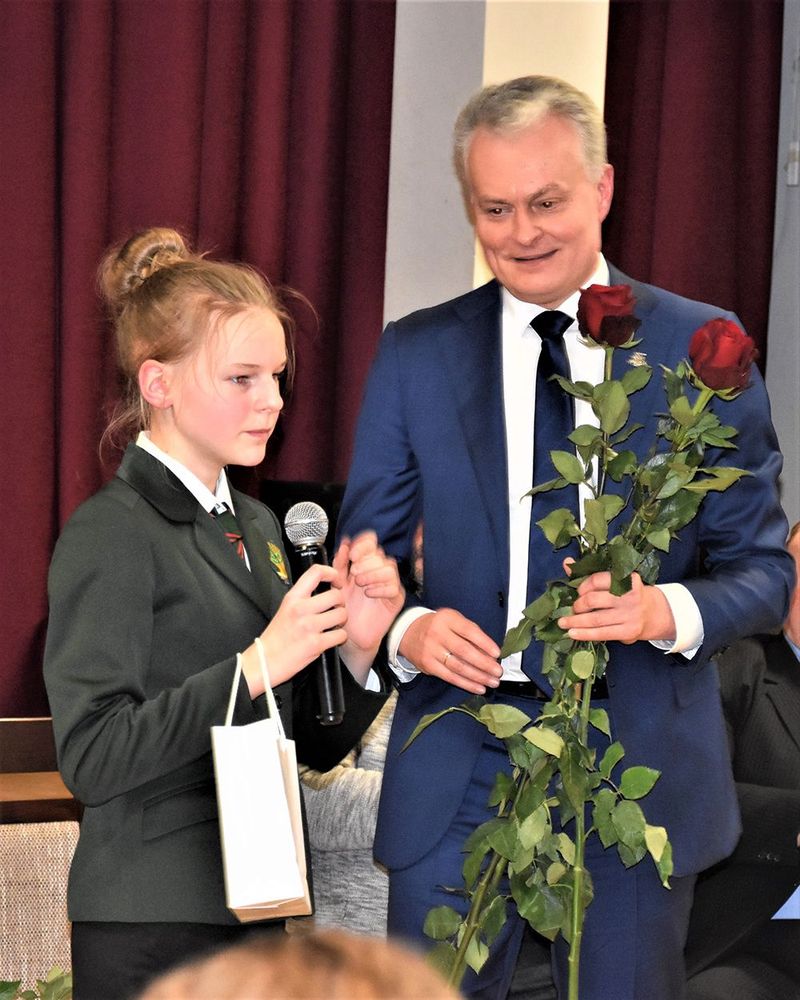 „Myliu savo mamą, mokytoją ir Prezidentą“, – išbėrė septintokė, tuo dar kartą pelnydama plojimų pliūpsnį. Antrąją rožių puokštę mergaitė įteikė savo mokytojai Rūtai Paulikienei.