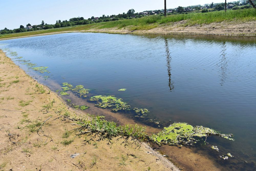 Su Kaziu apžiūrėjome ir kitas vietas, kur iš tvenkinio vanduo upeliu teka naujosios maudyklos link, ir pačią maudyklą. Reikia pasakyti, kad vienur vanduo iš tiesų pasidengęs žalia stora plutele. Žalių „karkalų“ matyti ir pačioje maudyklos vietoje, kur vandens skaidriu tikrai nepavadinsi.