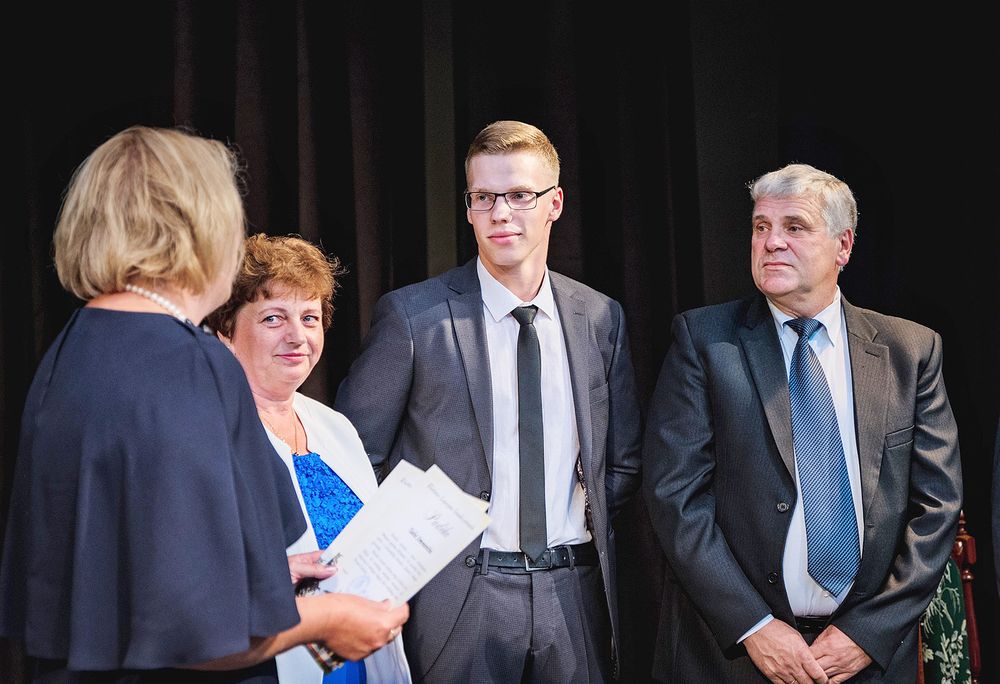 Ta­dui (cent­re) įtei­kia­mas bran­dos ates­ta­tas bei pa­dė­ka. Abi­tu­rien­tas kar­tu su ma­ma Ire­na (jam iš de­ši­nės) ir tė­čiu Sau­liu­mi