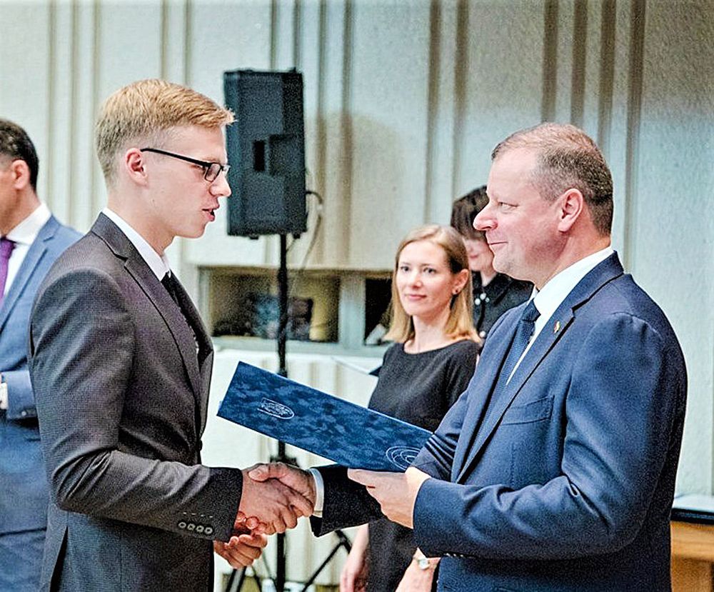 Tie­sa, vi­sai ne­se­niai Ta­das, kaip vie­nas ge­riau­siai bran­dos eg­za­mi­nus iš­lai­kiu­sių abi­tu­rien­tų, kar­tu su ki­tais tris ir dau­giau šim­tu­kų su­rin­ku­siais dvy­lik­to­kais, jų auk­lė­to­jais ir tė­vais lan­kė­si iš­kil­mė­se sos­ti­nė­je, kur prem­je­ras Sau­lius Skver­ne­lis įtei­kė pa­dė­kos raš­tus ir at­mi­ni­mo do­va­nas. Anot Ta­do, jam – tai svar­bus įver­ti­ni­mas ir pri­si­mi­ni­mas vi­sam gy­ve­ni­mui.