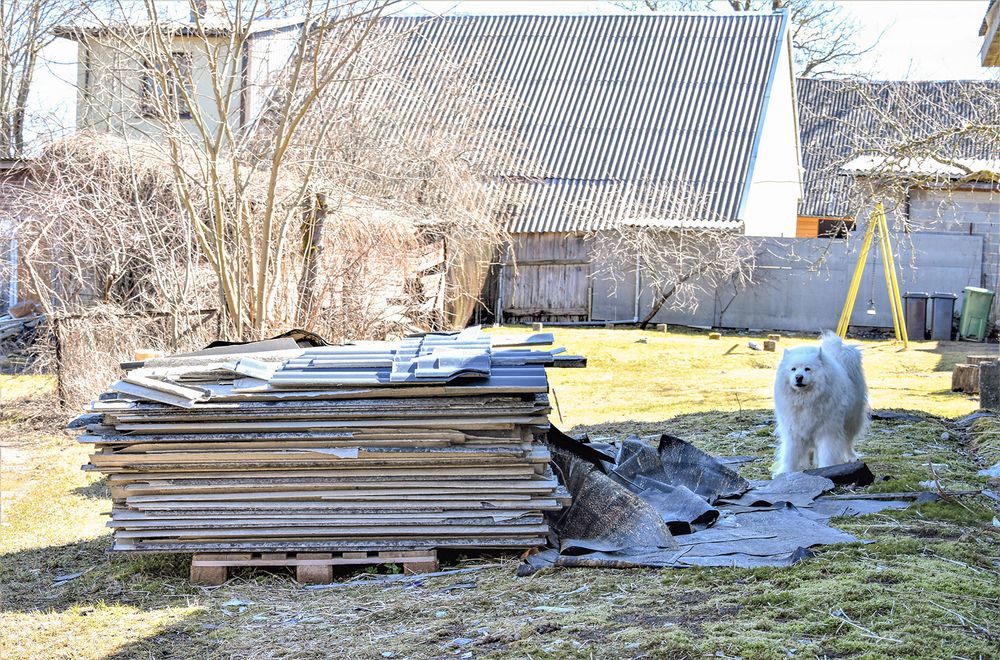 Nu­vykę nu­ro­dy­tu ad­re­su su­pra­to­me, kad mums skam­binęs skai­ty­to­jas nė kiek ne­pag­ra­ži­no – šakų krūva jau ge­ro­kai žmo­gaus ūgį pe­rau­gu­si, o ir ši­fe­rio – se­no­jo, tu­rin­čio svei­ka­tai pa­vo­jin­go as­bes­to – bent ke­lios rie­tuvės su­krau­tos, ne­mi­nint visą šį vaizdą „pa­gra­ži­nan­čių“ ir viską ap­lin­kui „už­mi­na­vu­sių“ šunų iš­matų krūvų krūve­lių.