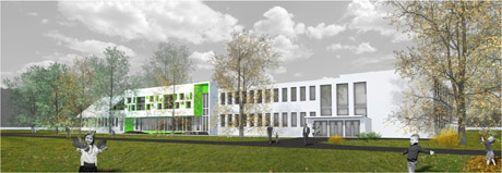 VIZUALIZACIJA: Bazilionų mokyklos priestato su esamais iš šonų mokyklos ir valgyklos statiniais vizualizacija.