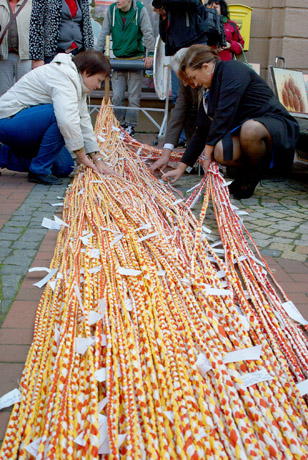 PYNĖ: Renginio „Šiaulių dienos 777“ metu ant grindinio ištiesta ir išmatuota rekordinė 1560 metrų ilgio „Saulės pynė“.