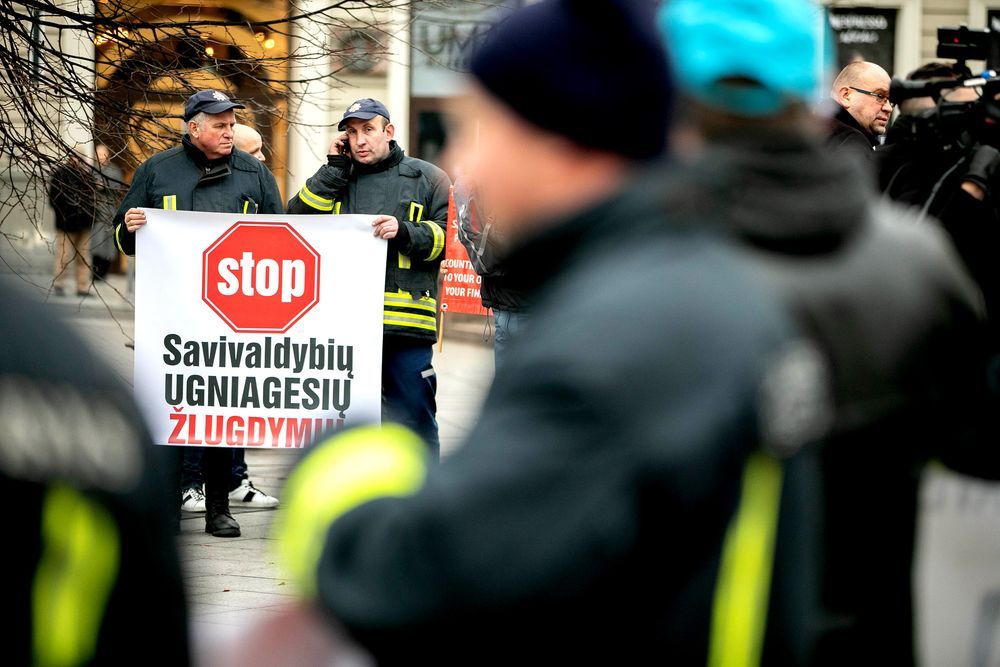 Ta­čiau prie Vy­riau­sy­bės su pla­ka­tais ran­ko­se su­si­rin­kę ug­nia­ge­siai ne di­des­nių al­gų rei­ka­la­vo, o bent jau iš­mo­kė­ti tai, ką už­si­dir­bo.