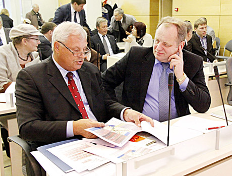 ATSTOVAI: Antanas Zenonas Kaminskas, „Rail Baltica“ projekto direkcijos vadovas (kairėje) ir susisiekimo ministro patarėjas Alfonsas Macaitis renka argumentus paaiškinti, jog yra du skirtingi „Rail Baltica“ projektai: vienas – moderinuoti seną vėžę per Šiaulius, kitas – naują tiesti per Panevėžį.