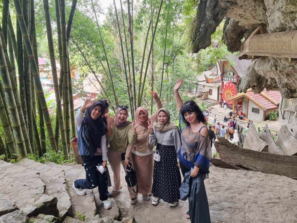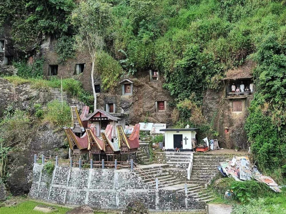 Neilgai trukus atgabena mus į tas keistas ir įdomias kapines. Graži aplinka, ryžių laukai iš vienos pusės, kalnai iš kitos. Kalnuose daugybė iškaltų uolų, o jose vienas po kito guldomi numirę žmonės. Kai kur statulos puošnios stovi. Gidas paaiškina, kad statulą turi teisę pastatyti ta šeima, kuri laidotuvių ceremonijai 25 buivolus nugalabijo. Kai kurių šeimų visi mirę nariai turi statulas. Turtingos šeimos, vadinasi. Šiaip dar noriu pasakyti, kad saloje niekas neskursta. Pėsti tik mudu vaikščiojom. Visi važiuoti – prabangios mašinos, motociklai, motoroleriai. Ubagų nėra nė vieno, senesnius žmones nemokamai pamaitina vietinėse valgyklėlėse.