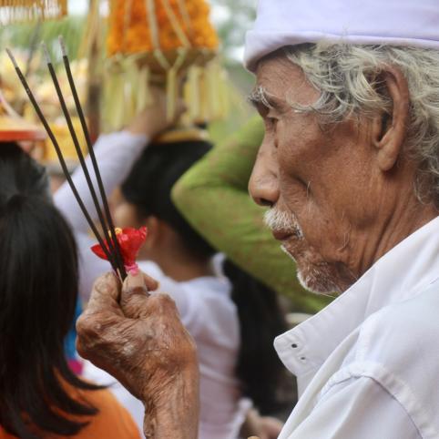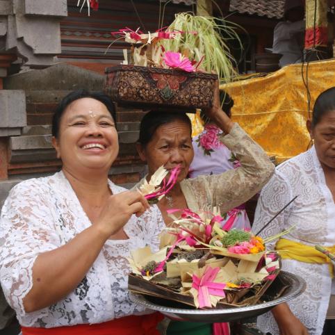 Pietums užsisakius mano mėgstamiausio Gado Gado patiekalo (virtos daržovės ir tofu su aštriu riešutų sviesto padažu) akį patraukia senolė. Oriai sėdėdama pakraštyje, rankomis ji kuria nuostabaus grožio krepšelius – iš bambuko, gėlių žiedų ir lapų. Mano žvilgsnį pastebėjęs rūpestingasis šeimininkas kaipmat paaiškina, kad šie krepšeliai skirti kaimynų šventyklos ceremonijai.