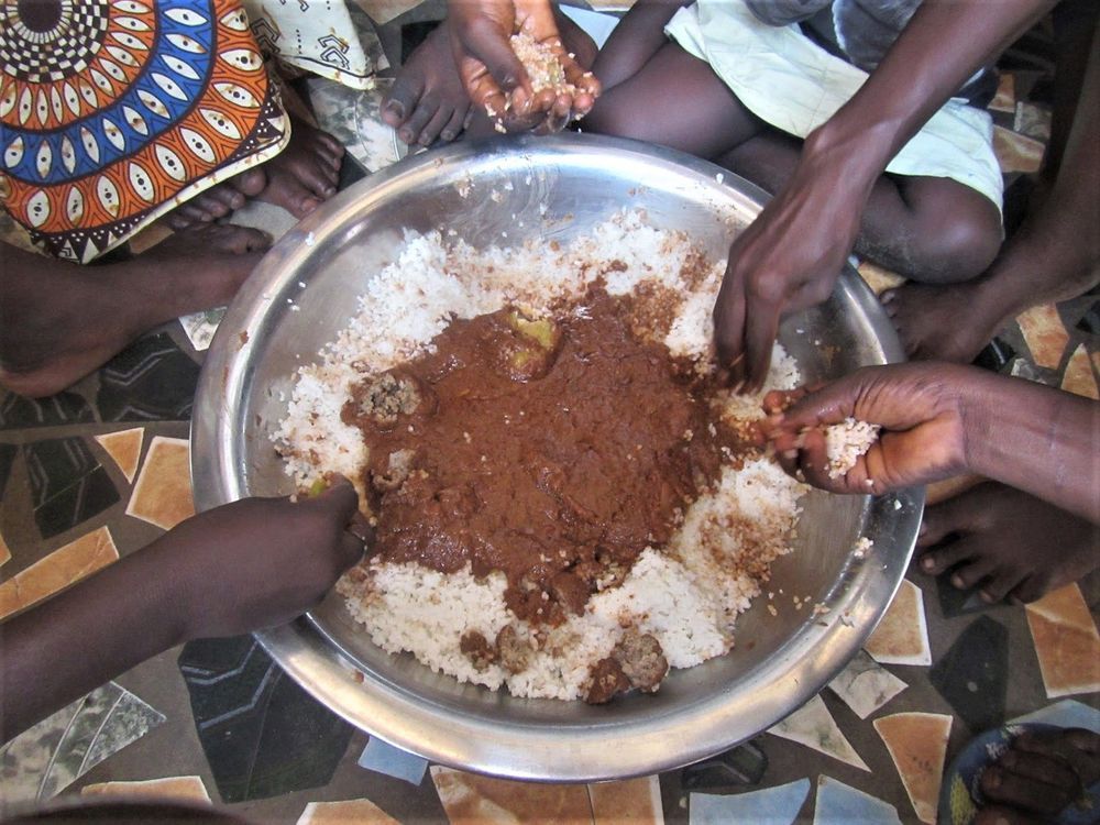 Po pasisveikinimo mus pasitikęs žmogus sušunka artimiausiam vaikui ir netrukus šis atbėga nešinas kėde. Prisėsk. Palūkėk. Netrukus maža mergaitė atneša didžiulį dubenį ryžių – žinoma, pirmiausia maistas! Ir dar su mano mėgstamiausiu riešutų sviesto padažu, trupučiu daržovių ir žuvimi bonga.