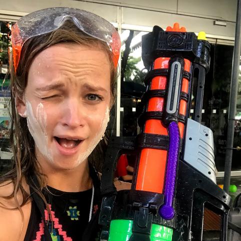 Įsi­giję did­žiu­lius van­dens šau­tu­vus išei­na­me į gatvę. Jau­čiu šaltą ata­ką į nu­garą, kaklą, akis. Žai­di­mas pra­si­de­da ir jau po pirmų 10 mi­nu­čių esu kiau­rai šla­pia. Pasiekia­me į pa­grin­dinę gatvę, kur be ga­lo gar­siai skam­ba mu­zi­ka. Prie­šais – tūkstan­tinė žmo­nių mi­nia ir vie­nas vi­sus jun­gian­tis da­ly­kas – van­duo.
