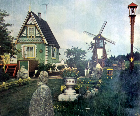 „Šitokį paveikslą gali pamatyti tik dailiai iliustruotose pasakų knygelėse. Greta kelio rymojo medinis namelis taip išpuoštas išmoningais ornamentais, kad buvo tiesiog nerealus ir priminė žaislą vaikų darželyje. Mažyčiais langais namelis žvelgė į kiemą, o jame – neįprastomis pozomis sustingę įvairių liaudies pasakų personažai, fantastiškų formų akmenys, kiek tolėliau – išskėtęs sparnus vėjo malūnas su paukščiais, žirgais ir kipšais“, – tarsi užburtas reginio, 1981 metais laikraštyje „Tiesa“ rašė Arnoldas Čaikovskis.