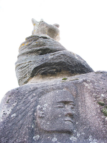 Moteris parodo ir daugiau kelmiškio akmentašio darbų. J. Liaudanskis nukalė akmeninę galvą betoniniam berniukui. Net nuo didžiojo akmens šono, ant kurio įsitaisęs velnias, žvelgia moters veidas.
