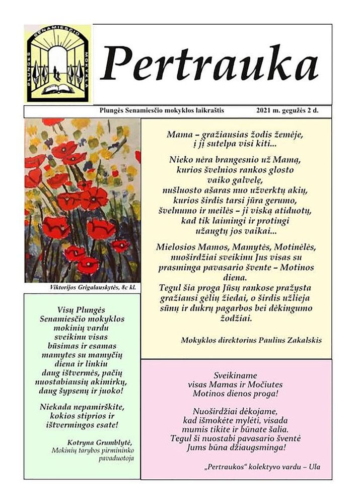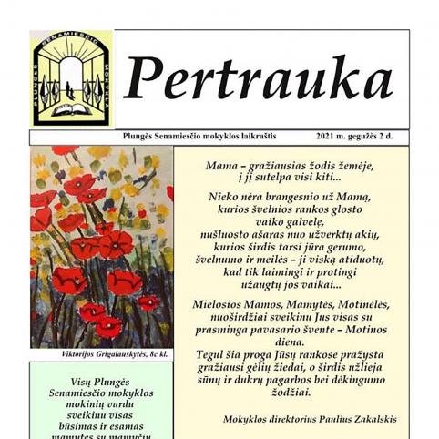 Nuo pirmojo atgimusio mokyklos laikraščio numerio, pasirodžiusio 2019 metų spalį, prieš pat Mokytojų dieną, praėjo jau nemažai laiko. Iš viso per dvejus mokslo metus išleidome 11 numerių. Laikraštis nėra popierinis. Tiesa, kol galėjome lankyti mokyklą, išspausdindavome vieną jo kopiją didesniu formatu ir pakabindavome stende mokyklos koridoriuje. Bet didžioji dauguma skaitytojų „Pertraukos“ numerius skaito mokyklos feisbuko paskyroje arba interneto svetainėje.
