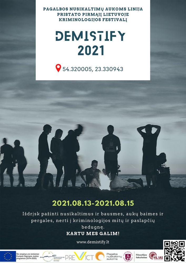 Kokias emocijas išgyvena nusikaltimą patyręs žmogus? Kaip ištiesti pagalbos ranką, kad ji būtų priimta? Su kokiais sunkumais susiduria tiek pagalbą teikiantis, tiek ją gaunantis? Kaip įveikti baimę? Į šiuos ir daugelį kitų ne tik nusikaltimų aukoms, jų artimiesiems, bet ir plačiajai visuomenei aktualių klausimų atsakymų ieškoti kvies pirmasis Baltijos šalyse kriminologijos festivalis DEMISTIFY, vyksiantis rugpjūčio 13-15 d. Kalvarijos savivaldybėje, Šilėnų kaime. Išsamiau: www.demistify.lt