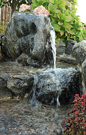 TĖKMĖ: Šeimininkų sukurtas dirbtinis nuolat tekančio vandens upelis suteikia kiemui žaismingumo ir gyvybingumo. Nuolat tekėti vandenį priverčia nedidelis siurblys.