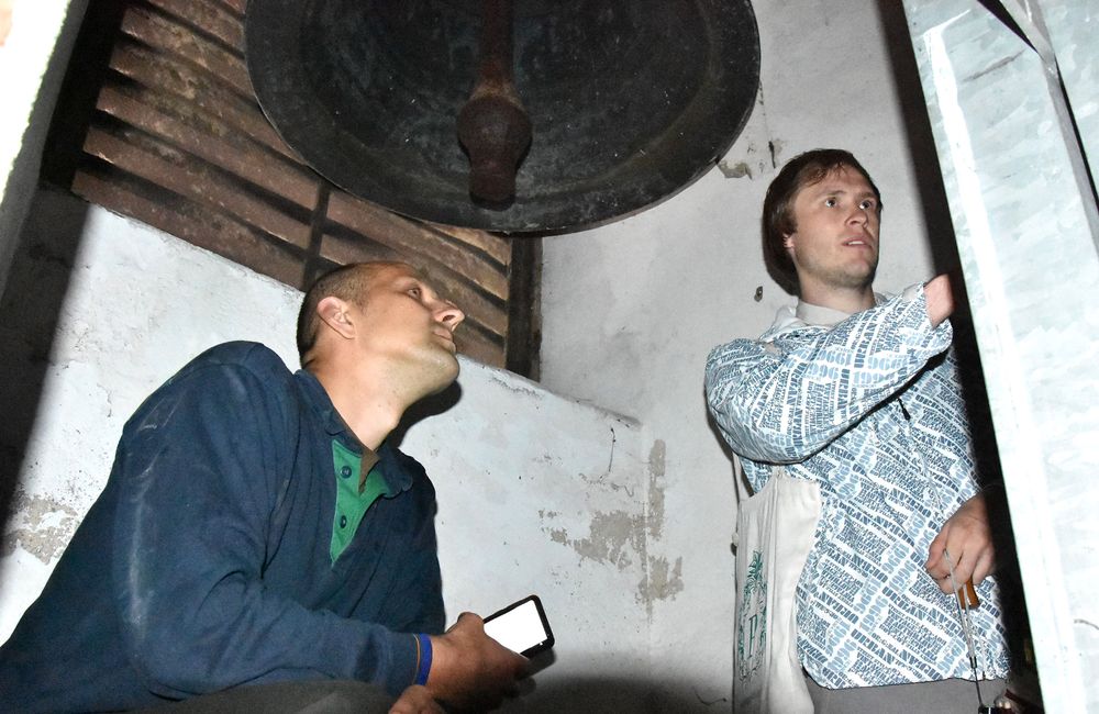 G. Ramono paraginti ekskursantai užlipo į varpinę. Tiesa, ne į patį jos viršų, o iki varpų. Tarp kurių – 1646 m. Vilniuje nulietas varpas. Tik dabar jis perskilęs ir nenaudojamas. Kiti keturi varpai – veikiantys, juos 2001 metais Plungei dovanojo kunigas Gerhardas Lange iš Vokietijos.