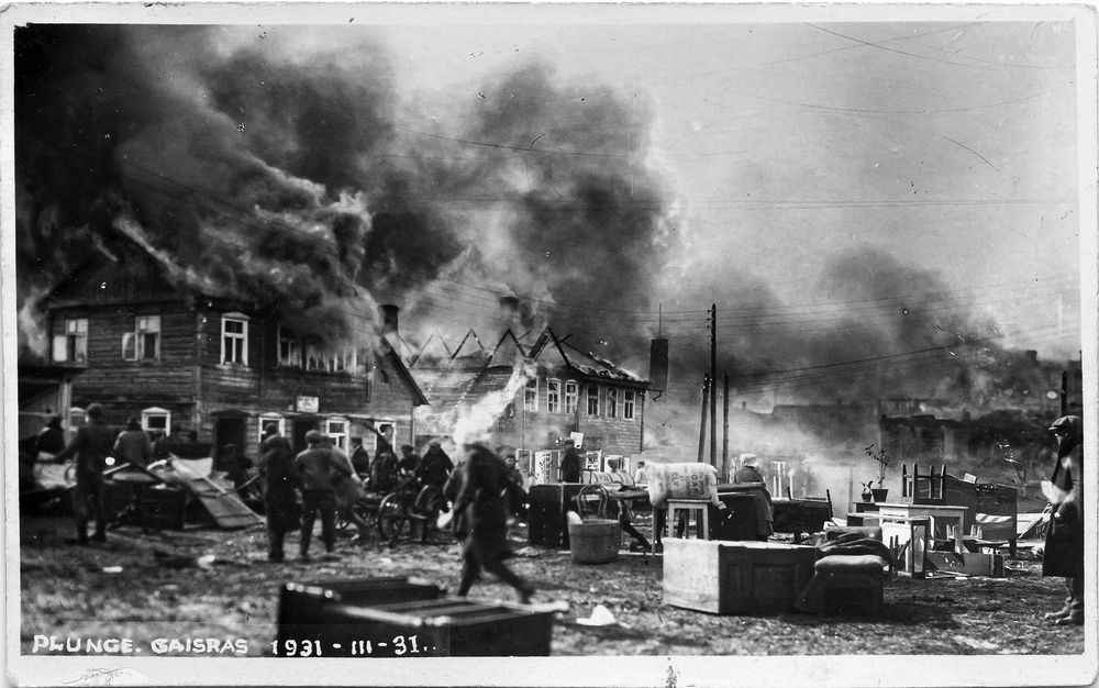 Bet nespėjo žmonės ir verslas dorai atkusti, o Plungę ištiko dar vienas siaubas – didysis miesto gaisras. Jis kilo lygiai prieš devyniasdešimt metų – 1931-ųjų kovo 31-ąją. Vieni pirmųjų apie tai pranešė „Žemaičių prieteliaus“ žurnalistai, balandžio 2-ąją paskelbę trijų sakinių žinutę: „Plungės mieste, Resto viešbuty, kovo 31 d. kilo gaisras, kurs netrukus smarkiai išsiplėtė. Miestas labai apdegė. Kitame numeryje paduosime smulkesnių žinių“ (čia ir toliau cituojamų minėto laikraščio rašinių kalba ir stilius netaisyti).