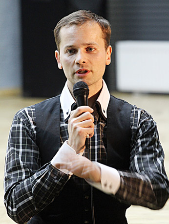 ŠYPSENA: Baleto primarijaus Nerijaus Juškos plati šypsena nedingo viso susitikimo su šiauliečiais metu – jis šmaikščiai ir gyvai pasakojo apie baleto pasaulį, teatro užkulisius, savo gyvenimą.
