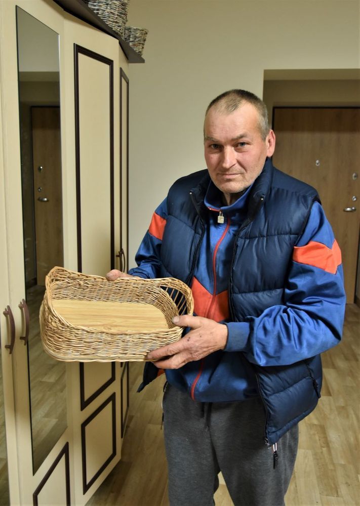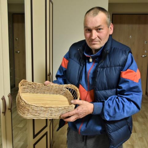 „Čia mano malonumas. Nurimsti, pailsi pindamas“, – prisipažino Algis. Ir pasidžiaugė dabar vėl galintis tuo užsiimti, mat persikėlus į socialinį būstą, Plungės krizių centre liko visos priemonės, reikalingos pinti. Kol nepasigamino savų, šį užsiėmimą kuriam laikui teko atidėti į šalį, bet visai neseniai sulaukė centre dirbančios R. Gedgaudienės prašymo nupinti tiek krepšių, kiek įmanoma spėti per dvi–tris savaites. Tad nieko nelaukęs pasiraitojo rankoves ir ėmėsi darbo.