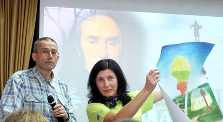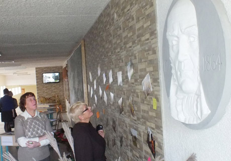 DOVANA: Papilės Simono Daukanto gimnazijos pagrindinio ir neformaliojo ugdymo skyriaus vedėja Kristina Dorofėjienė priėmė Šiaulių Simono Daukanto gimnazijos atstovų dovaną – plakatą, vaizduojantį žygį „Kultūros kelias Daukantui“.