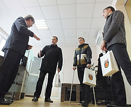 LAIMĖTOJAI: Europos kiokušin karatė čempionus Eventą Gužauską (iš dešinės), Irmantą Šimulionį ir jų trenerį Vladimirą Silvaško pasveikino rajono meras Vitalijus Mitrofanovas.