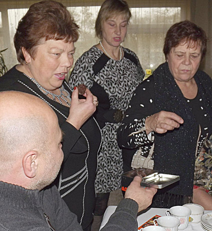 SALDAINIAI: Komisija ragauja Žiurių kaimo bendruomenės pirmininko Arūno Činčio obuolių saldainių, aplietų juoduoju šokoladu.