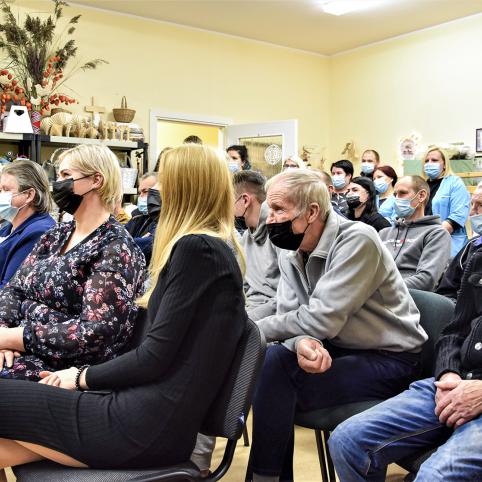 Būtent šiame kambaryje buvo sukurti ir advento vainikai, kuriuos Krizių centras prieš šventes išsiuntinėjo savo bičiuliams. Už šias dovanas dėkojo ir J. Arlauskaitė bei G. Duoblys, taip pat susitikime dalyvavęs meras Audrius Klišonis.