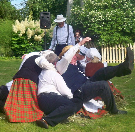 šieno su kitais nukritęs, mero padėkos raštu apdovanotas Gediminas Andrašiūnas (su šiaudine skrybėle).