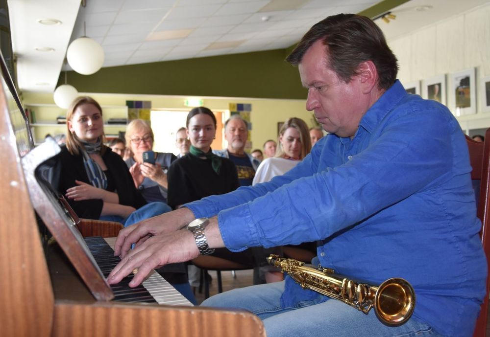 Saujelė plungiškių iš pirmų lūpų išgirdo ne tik muzikos virtuozo biografijos vingius, atvedusius iki prestižinių pasaulio koncertų salių, bet ir pasimėgavo užburiančiomis maestro saksofono melodijomis.