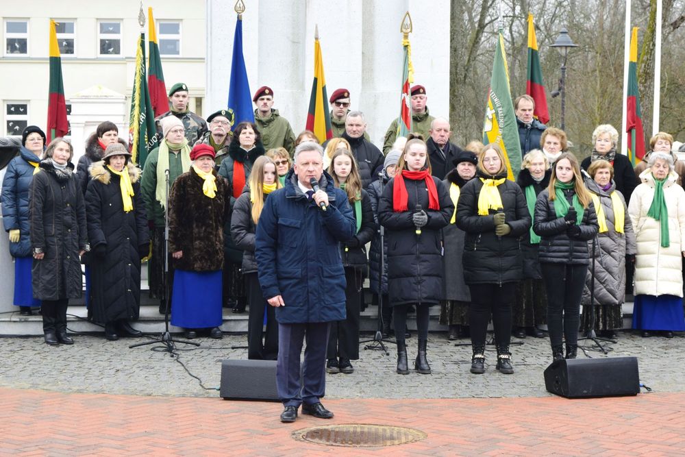 Minėjimas persikėlė prie Laisvės paminklo. Visus susirinkusiuosius čia pasveikino Seimo narys Jonas Varkalys, rajono meras Audrius Klišonis ir klebonas dekanas Vytautas Gedvainis. Skambių dainų akordus miestiečiams dovanojo choras „Tėvynės ilgesys“, Trečiojo amžiaus universiteto dainininkai bei Kultūros centro vokalinis ansamblis „Hello“.