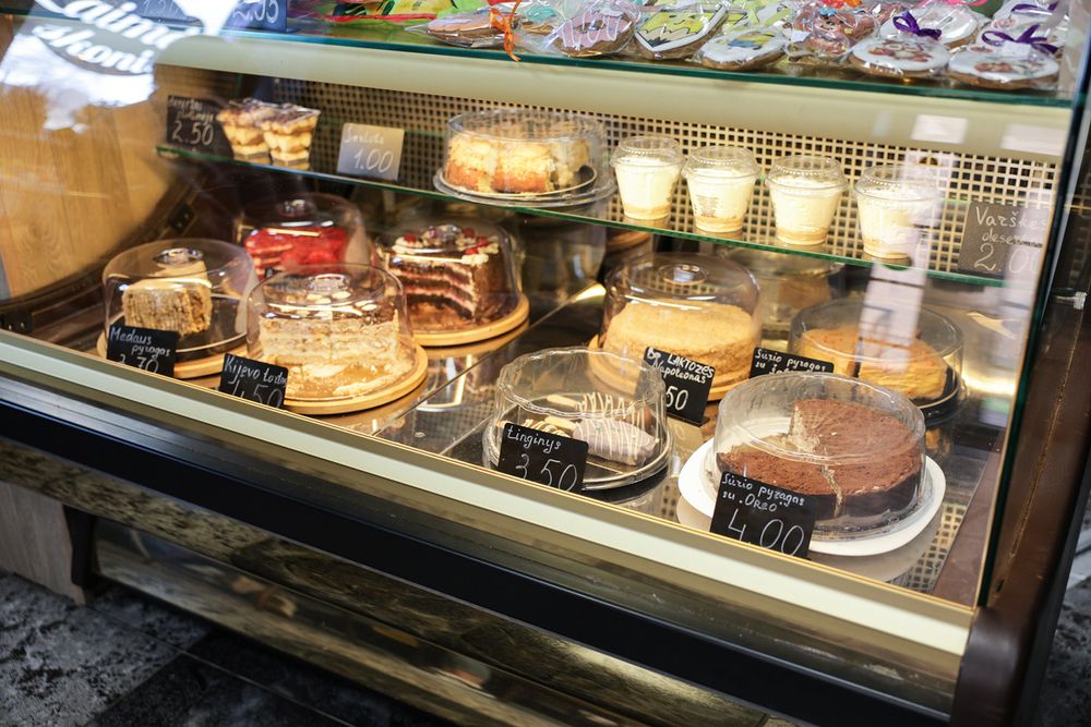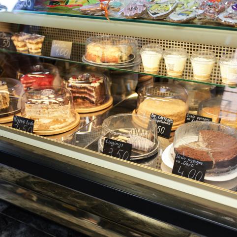 „Vertikalus karamelinis „Medutis“, „Kijevo“ tortas, „Napoleonas“ be laktozės, lietuviai mėgsta sūrio pyragą, jį transformavau įvairiomis variacijomis – su šaltalankiais, su „Oreo“, – prie vitrinos vardija Aliona.