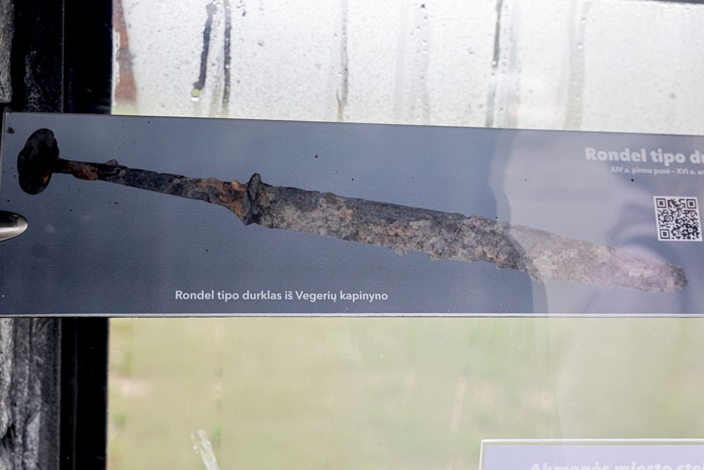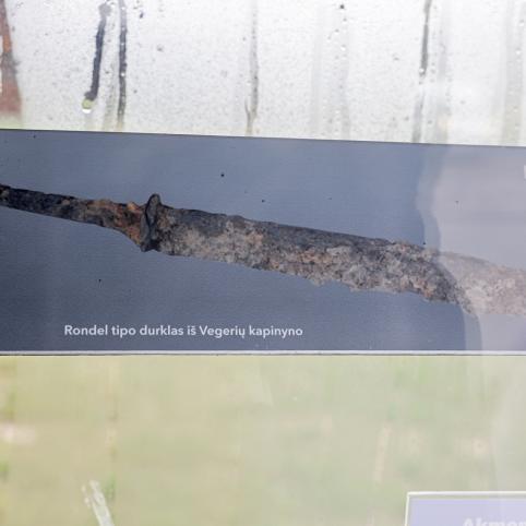 Sienos ekspozicijos nuotraukoje galima pamatyti, kaip atrodė Vegeriuose rastas Rondel tipo durklas, dabar saugomas Lietuvos nacionaliniame muziejuje. Radinys buvo skubiai restauruotas, jau eksponuotas parodoje.