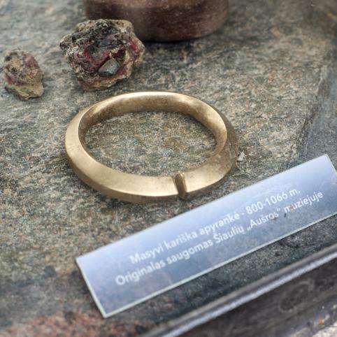 „Vegeriuose atradome žiemgalių laikotarpį nuo I–II amžiaus, yra ir V–VIII, XIII–XV amžiaus radinių. Čia atvaizduotas žiemgališkas laikotarpis, – stabteli prie sienos. – Matote kario apyrankės, datuojamos 800–1066 metais, kopiją, ypatingas radinys – ir Suginčių segė. Visi šie radiniai yra iš Vegerių ir Suginčių, esančių šalia.“