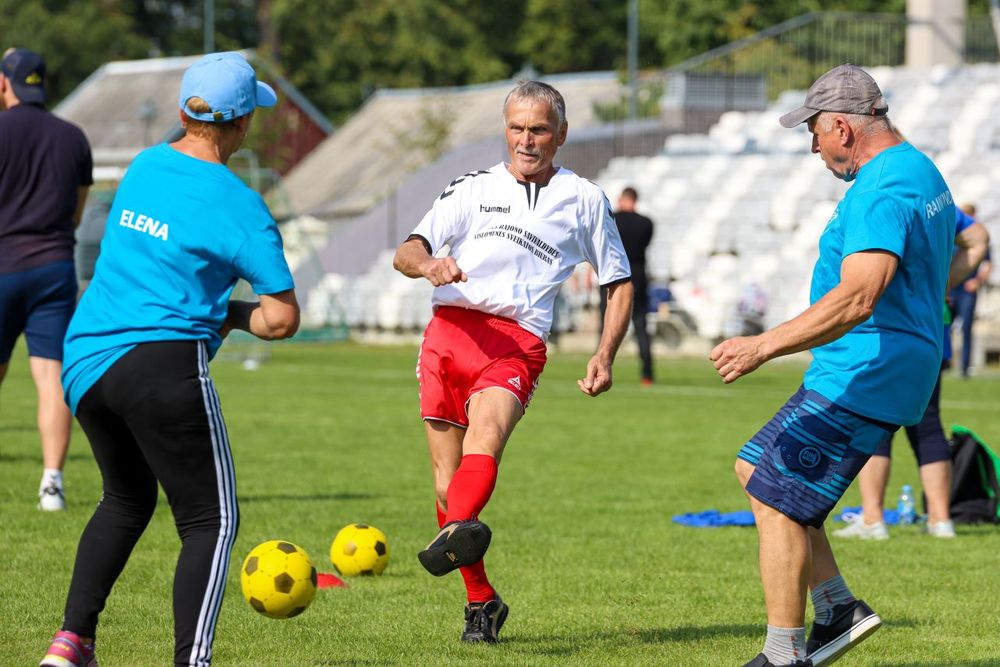Futbolas vaikštant – puikus sportas senjorams ir turintiems sveikatos sutrikimų. Nedidukės aikštelės, joms pritaikyti vartai, įdomios rungtys (pavyzdžiui, spiriant sviedinį į virš vartų kabantį lanką), net kamuolys minkštutėlis – šis žaidimas tikrai įtraukia ir traukia išbandyt jėgas. Bet kaip susilaikyti nebėgus prie kamuolio?! Va kur mokomasi bendradarbiauti ir būti kantriam, nes jei lėksi strimgalviais, gausi baudą.
