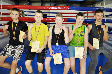 MEDALININKAI: Šalies jaunių bokso pirmenybių medalininkais tapo  (iš kairės) Dovydas Bykovas, Gedas Petrošius, Gražvydas Partikas, Aleksandras Nėcelis ir Deivydas Bykovas.