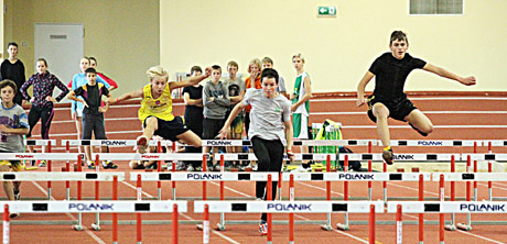 DAUGIAKOVĖ: Viena iš penkių daugiakovės rungčių buvo 60 metrų barjerinis bėgimas, čia antrą vietą užėmė šiaulietis Faustas Kavaliauskas (pirmas iš dešinės).