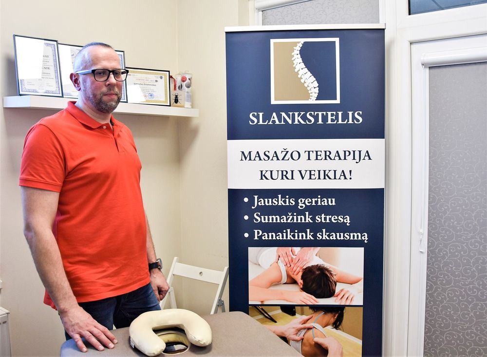 „Stresas mūsų dienomis tampa įprastu reiškiniu. Ypač pas-taruoju metu, kai situaciją valdo virusas. Todėl didelei daliai mano pacientų prie įprastų stuburo problemų prisideda ir su stresu susiję raumenų spazmai. Viršutinės dalies, pečių lanko, kaklo srities, kartais trapecinio raumens jautrumas tada būna toks didelis, kad sudėtinga atlikti bet kurį manualinį veiksmą. Tokiu atveju labai veiksmingai padeda trigerinio taško neutralizavimas kartu su giliu audinių masažu“, – savo darbo specifiką apibūdina plungiškis.