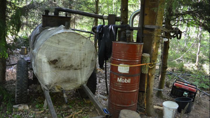 Į Diš­lių kai­mo gy­ven­to­jo „vir­tu­vę“ pa­rei­gū­nai įsi­su­ko rugp­jū­čio 15-osios po­pie­tę. Tie­sa, ten jie ne šiaip sau at­si­dū­rė, o dirb­da­mi pa­gal iš anks­to nu­ma­ty­tą pla­ną. Ūki­nia­me pa­sta­te įkur­din­to­je „ga­myk­lo­je“ tą­kart pa­rei­gū­nai ap­ti­ko vi­są na­mi­nu­kės ga­my­bai rei­ka­lin­gą įran­gą. Pas­ta­ro­ji bu­vo ne tuš­čia – ras­ti 25 lit­rai be­spal­vio skys­čio, tu­rin­čio spe­ci­fi­nį na­mi­nu­kės kva­pą, bei 830 lit­rų rau­ga­lo, tin­ka­mo na­mi­nei deg­ti­nei ga­min­ti. Iš to­kio kie­kio bū­tų pri­var­vė­ję dau­giau nei 70 lit­rų ab­so­liu­taus eti­lo al­ko­ho­lio.