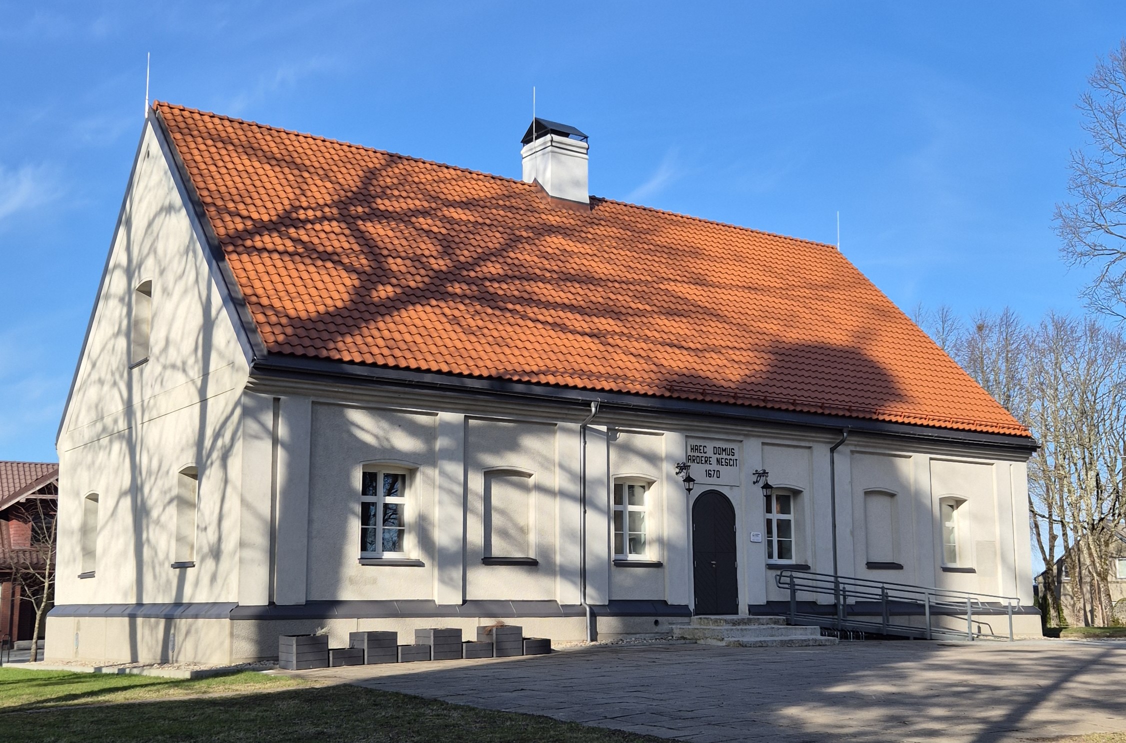 „Virš baltojo namo durų galime išvysti lotynišką pavadinimą „Haec domus ardere nescia“, kuris reiškia – šis namas nedega. Tik statybos metai užrašyti su klaida, ją padarė sovietmečio dailininkas, restauravęs užrašą parašė 1670 metus, nors iš tikro statybos datuojamos 1780 metais“, – kalbėjo R. Masalskienė.